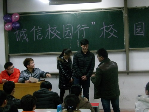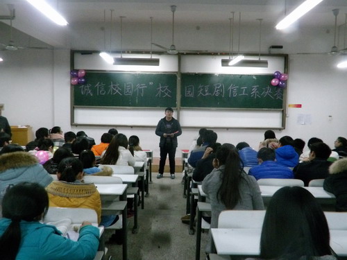 2015年12月16日晚7点,信工系“诚信校园行”校园短剧决赛在资讯楼116顺利进行。出席本次比赛的嘉宾和评委有信工系党总支王新平书记,行政秘书兼团委书记张娟老师、资助中心崔雅斌老师、资助专员崔晓宁老师、辅导员王保进老师和以及全体二十二届员工会主席团成员。