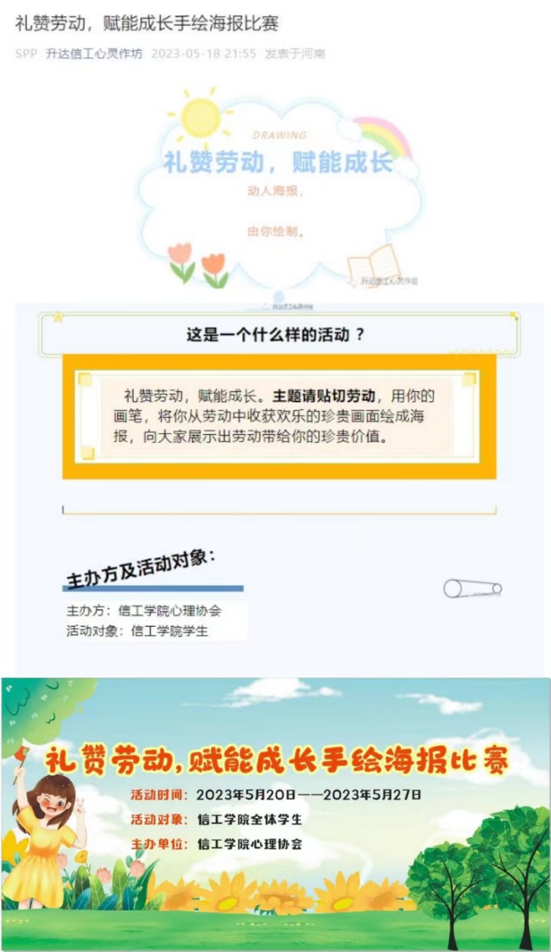 2023年5月20日至5月27日,太阳成集团tyc122cc心理协会开展“礼赞劳动 赋能成长”手绘海报征集活动。