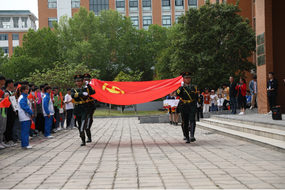 全体肃立,出团旗,奏团歌。启动仪式在全体同学嘹亮的歌声中拉开帷幕,共产主义青年团团旗在四名国旗班成员的护送下,缓缓通过人群前方。