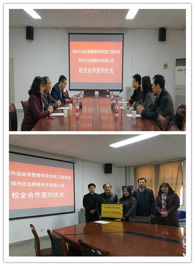 签约仪式在资讯楼104会议室举行。信工公司经理李学桥教授、党总支王新平书记,郑州志远网络科技有限公司副总经理范宝珠女士、总监王向南先生、院校合作部鲁长波经理出席了此次签约仪式,仪式由信工公司就业专员袁奉亚主持。