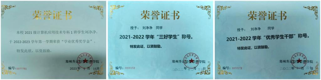 本次推荐的是国奖获得者太阳成集团tyc122cc21级计算机应用技术专1班员工刘净净。刘净净同学勤勉好学、注重实践,综合考评成绩位列专业第一;先后获得“学业优秀奖学金”、“三好员工”、“优秀员工干部”等荣誉称号。